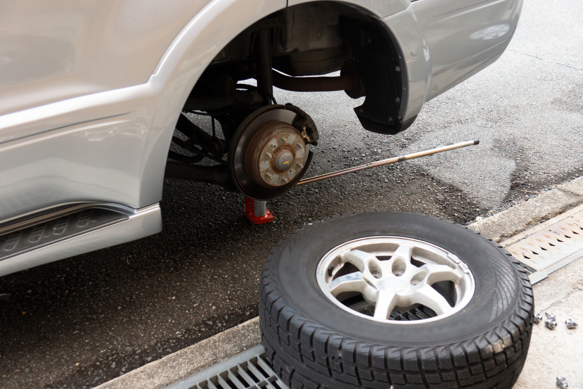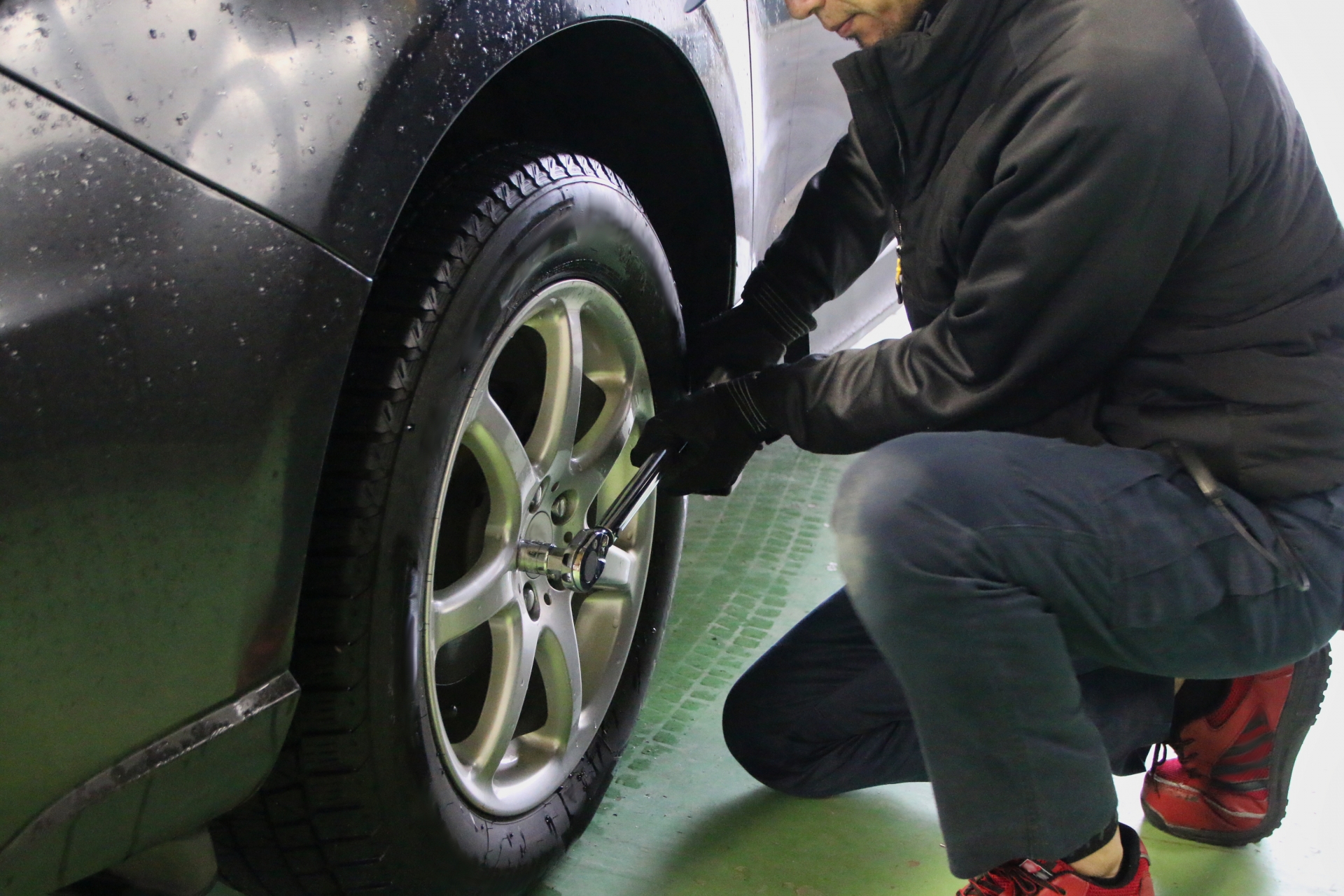 タイヤを装着したらジャッキをゆっくり下ろし、タイヤが接地した状態でナットを対角線順に本締めします。可能であればトルクレンチを使って規定トルクでしっかり締め付けましょう。