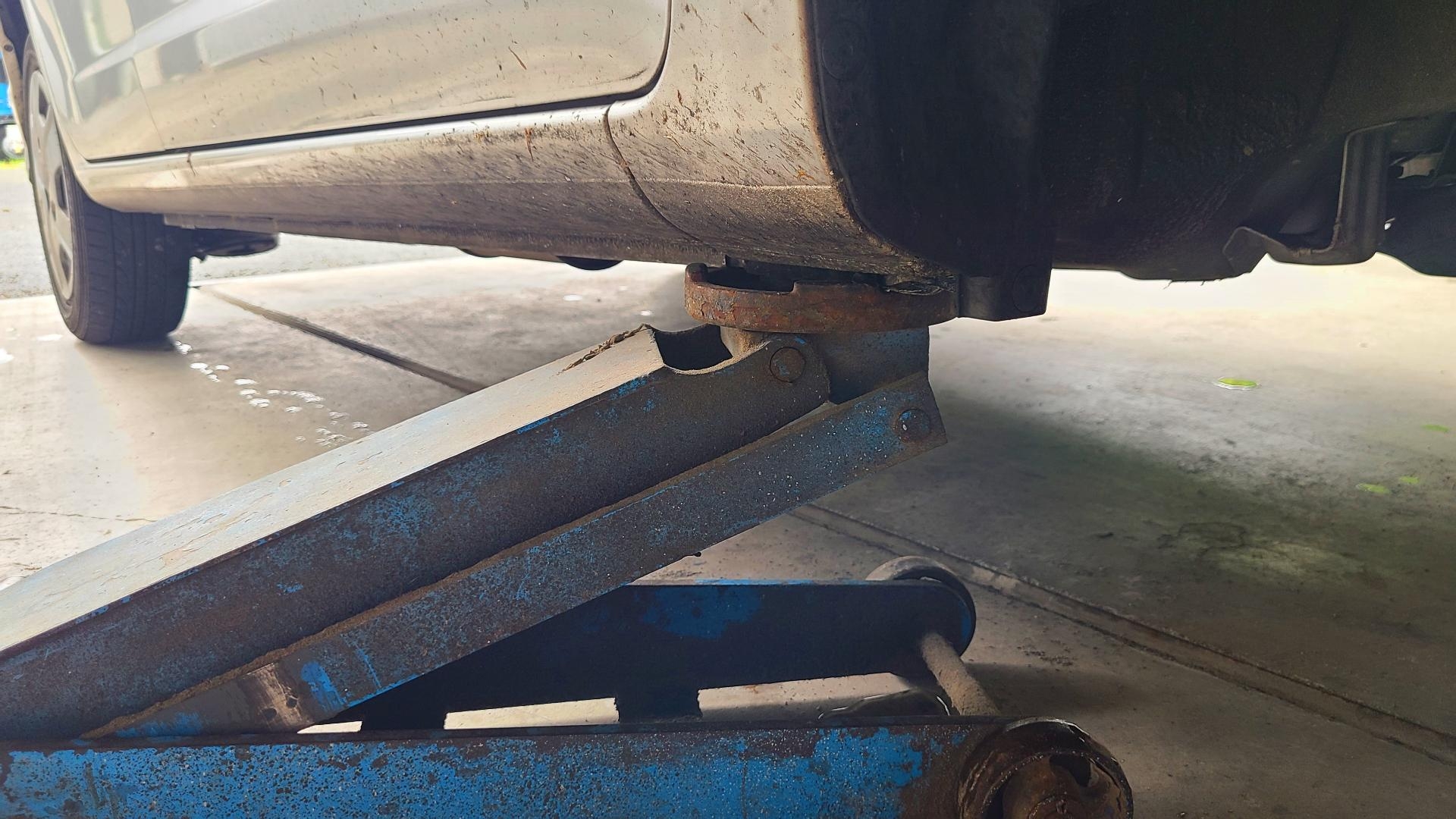 ジャッキを車体の指定ジャッキポイントに当てて車体を持ち上げます。ポイントを誤ると車体を傷めたりジャッキが外れて倒れる恐れがあるので注意します。