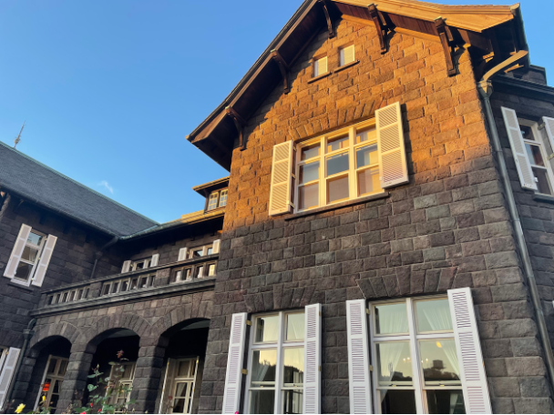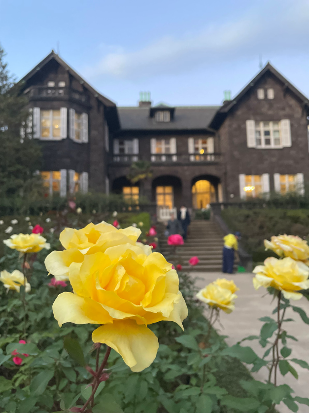 園内には、歴史を感じさせる建物もあります。洋館は重厚感があり、庭園の景観と調和しながら、異国情緒あふれる雰囲気を演出しています。バラ庭園とともに眺めることで、より一層その美しさが際立ちます。